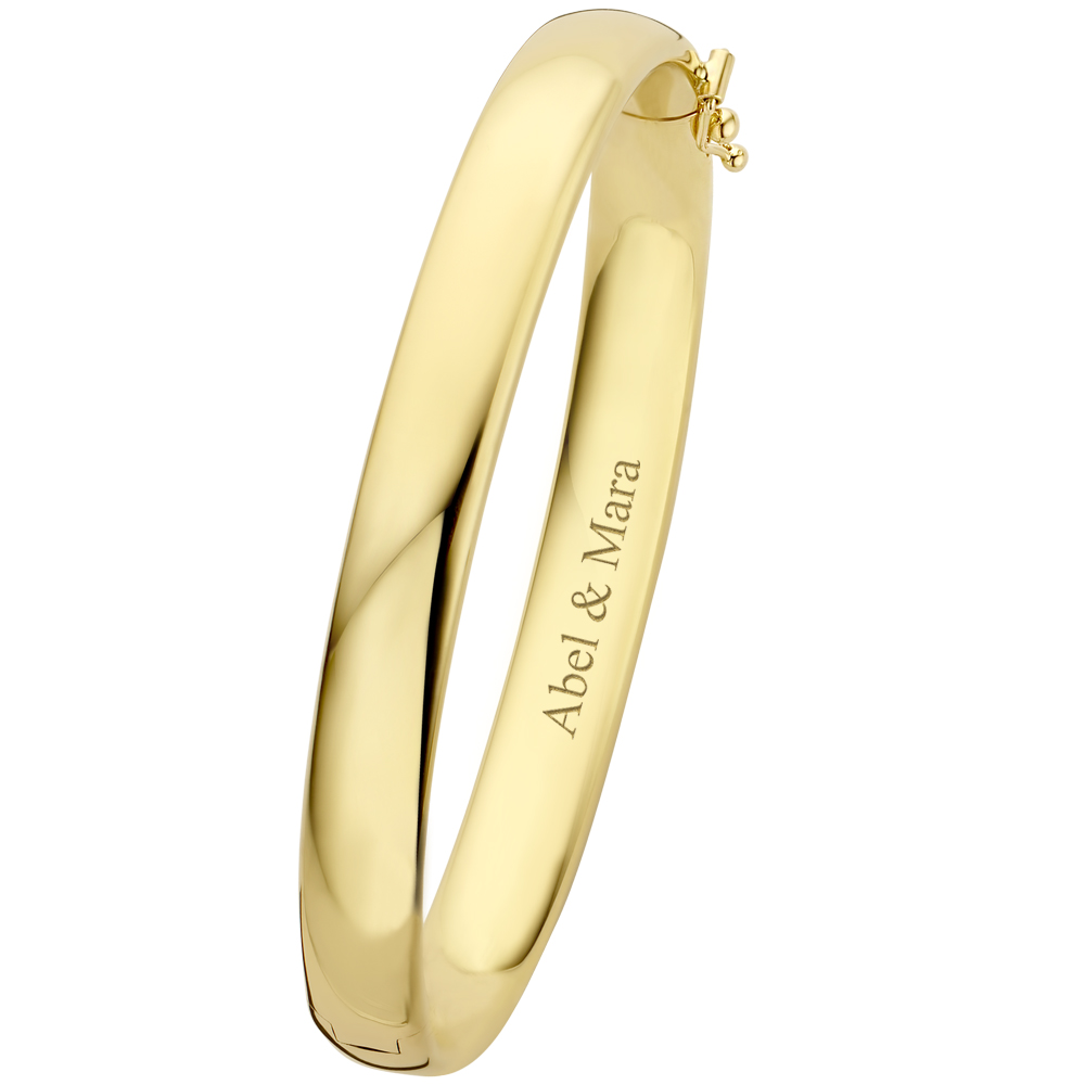 De slavenarmband heeft een ovale buis en is glanzend. Hij is 8 mm breed en door de zilveren kern een massief armband. Deze slavenarmband kan worden gegraveerd aan de binnen- en buitenkant.