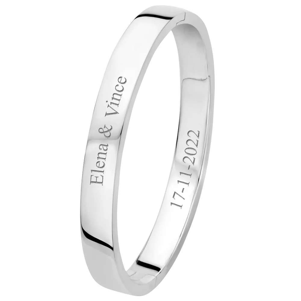 De slavenarmband heeft een vlakke vorm en is glanzend. Hij is 8 mm breed. Deze slavenarmband kan worden gegraveerd aan de binnen- en buitenkant.