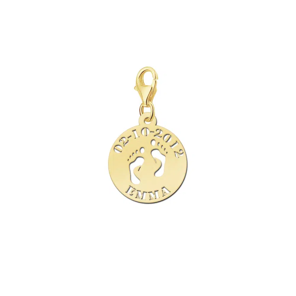 Bedel goud voetjes met naam en datum Dit gouden bedeltje met voetjes wordt voorzien met de naam en datum van jouw keuze. Door de karabijnhaak aan de hanger, kan je de bedel makkelijk aan een armband of collier hangen. Het materiaal waar wij het bedeltje van maken is 0,4 millimeter dik en van echt 14 karaats goud. De bedel heeft een diameter van 16mm. Snelle levering en je betaalt geen verzendkosten!