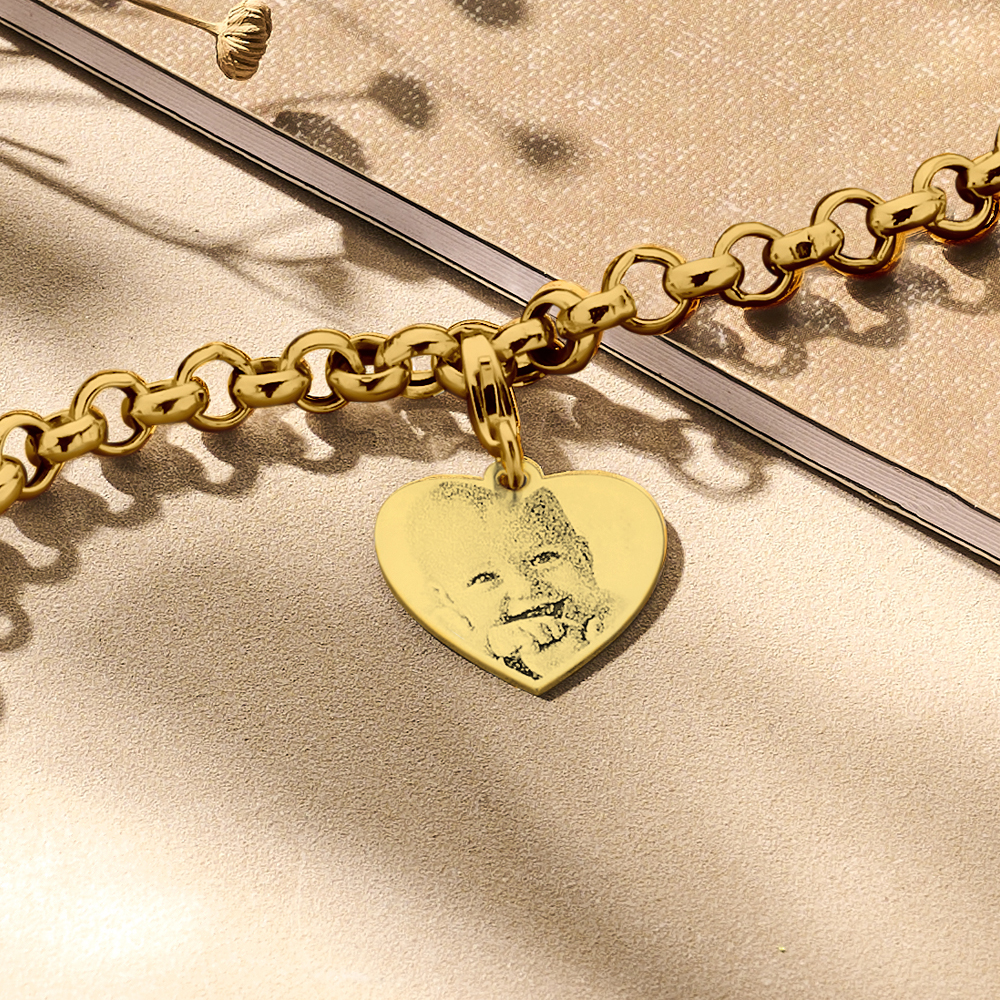Mooie hartvormige bedel met foto gemaakt van 14 karaat goud. Deze bedel met foto heeft een grootte van ca. 17 x 18 mm en een dikte van 0,6 mm. We graveren deze bedel hart met je lievelingsfoto. Onze designers maken een mooie uitsnede van de foto waarna deze in de gouden bedel gegraveerd wordt. Omdat de gravure echt in de bedel zit kan de foto niet zomaar van de bedel af gaan. De foto gravure maken we nog wat donkerder door middel van een speciale techniek zodat deze extra goed zichtbaar is.