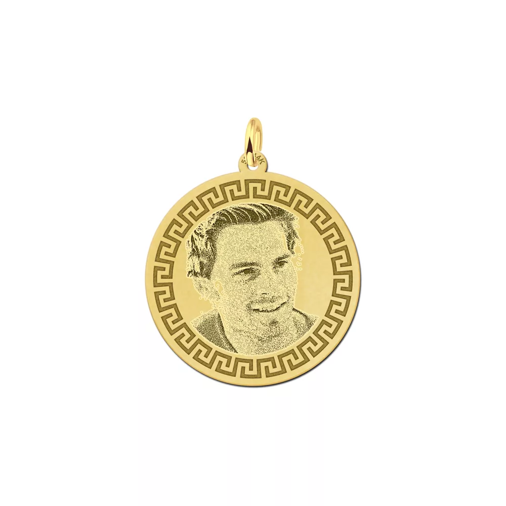 Deze mooie fotohanger met meander rand van goud wordt voor jou vervaardigd in 14 karaat goud. De fotohanger heeft een diameter van 27 mm en een dikte van 0,6 mm. In de fotohanger van goud graveren wij de foto van jou keuze. Omdat de foto echt in de hanger wordt gegraveerd kan deze niet vervagen of van de gouden hanger afgaan. Voor de perfecte afwerking maken wij de fotogravure met een speciale techniek wat donkerder, zo is deze altijd goed te zien!