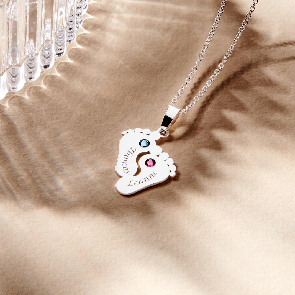 Deze 925 Sterling zilveren hanger heeft de vorm van twee voetjes en kan gepersonaliseerd worden met twee gravures. Bovendien is er plek voor een geboortesteentje dat is gemaakt van Swarovski kristal.
