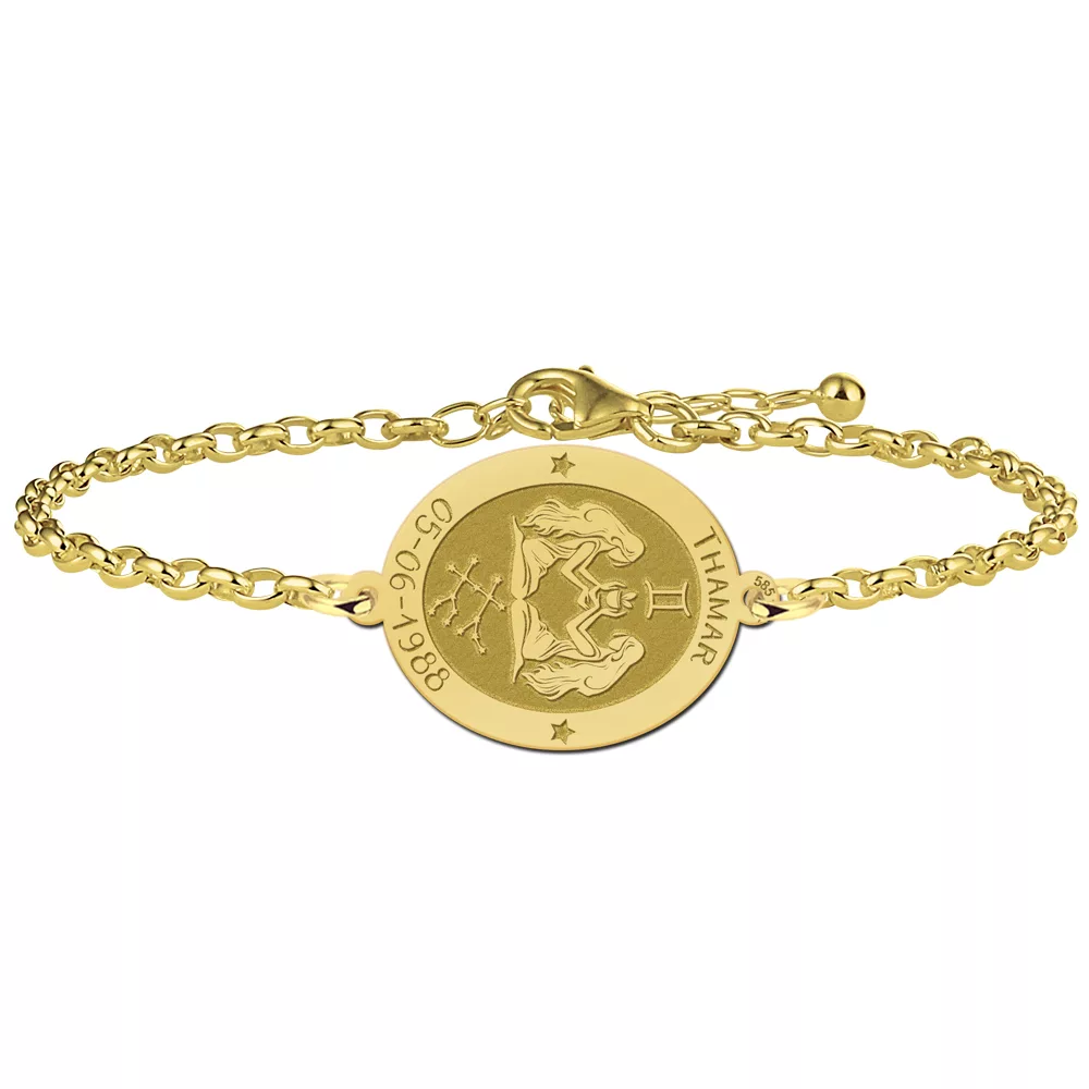 Gedreven, intelligent, vrijgevig en sociaal; kenmerken die typisch zijn voor een Tweeling. Deze armband sterrenbeeld past mooi bij iemand die Tweeling is. Gemaakt van 14 karaat goud en te personaliseren met een eigen unieke gravure.