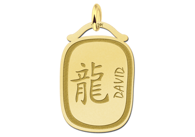 Het chinese symbool draak en de naam van jouw keuze worden in deze mooie hanger gegraveerd. De gouden hanger is ca. 17 x 25 mm.