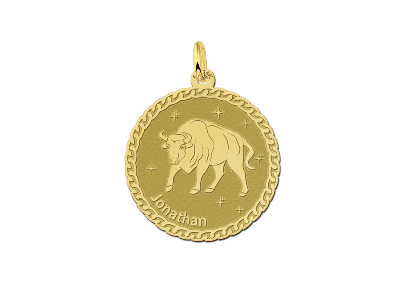 Deze gouden ronde hanger heeft het sterrenbeeld Stier erop gegraveerd. De Stier is trouw, geduldig, doelgericht en liefdevol. Hij of is geestelijk erg sterk en praktisch ingesteld.