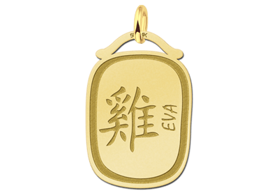 Het chinese symbool haan en de naam van jouw keuze worden in deze mooie gouden hanger gegraveerd. De sterrenbeeld hanger is ca. 17 x 25 mm.