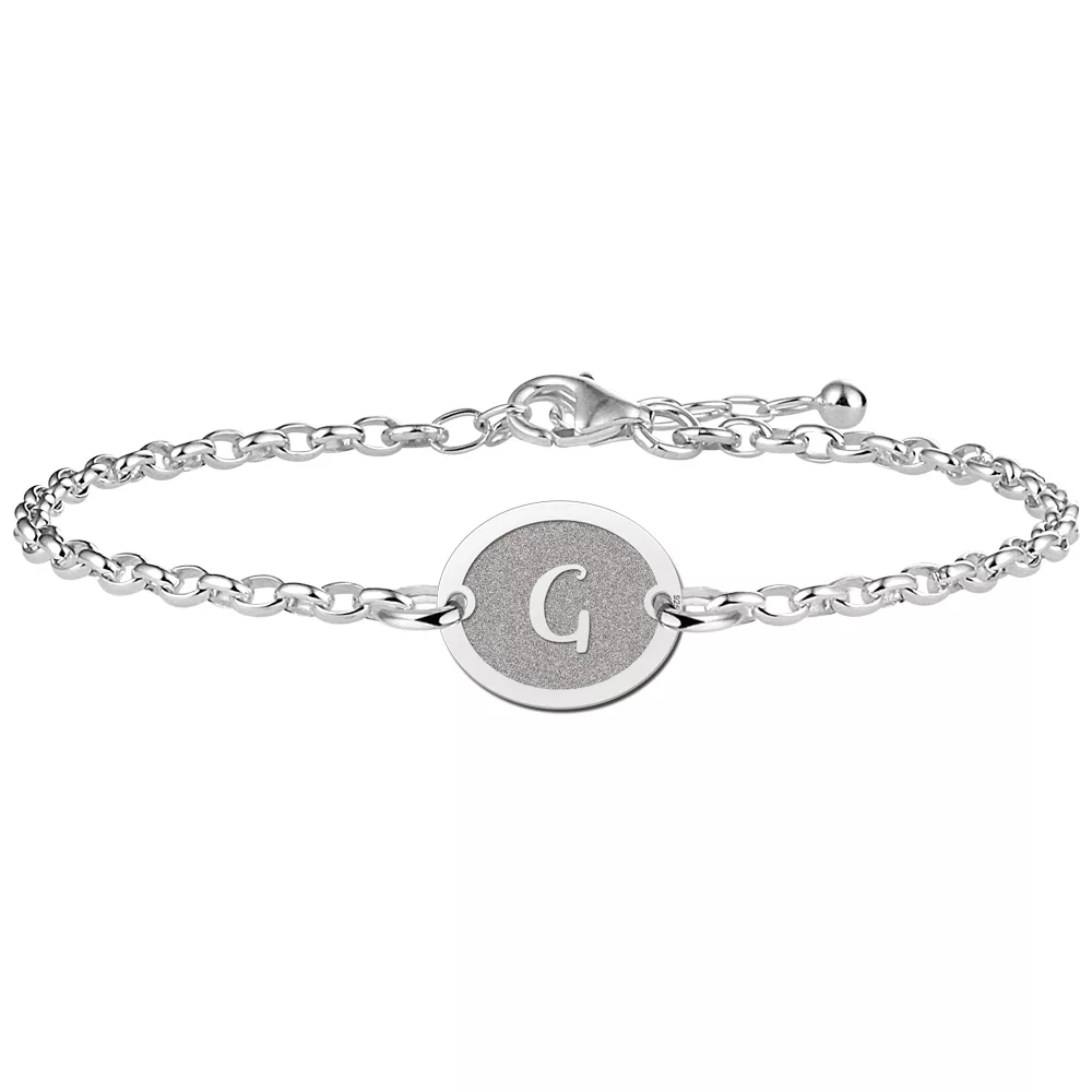 Deze zilveren armband met letter heeft de vorm van een ovaal en ziet er zowel eenvoudig als elegant uit. De armband is gemaakt van 925 Sterling zilver en kan gepersonaliseerd worden met een letter naar keuze.