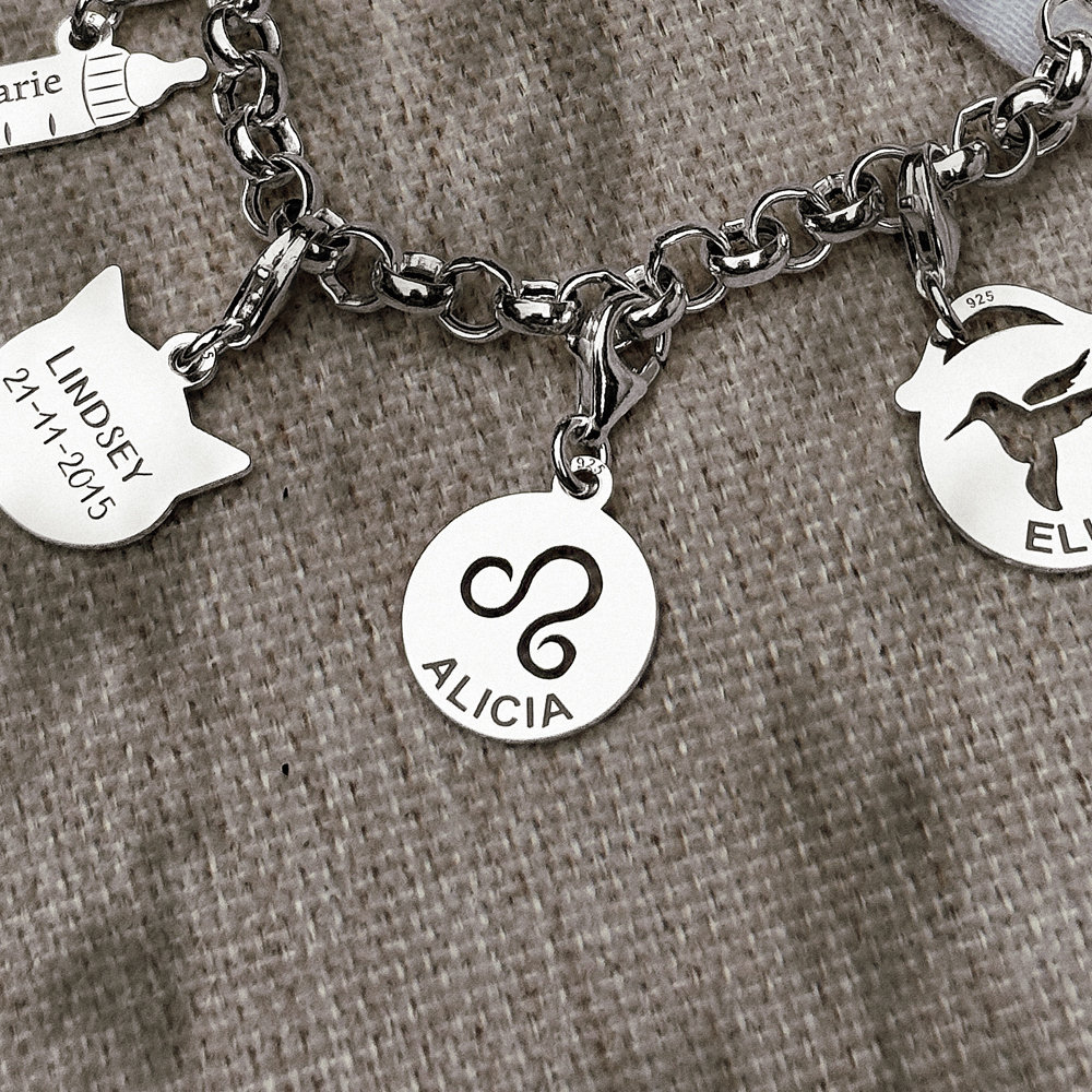 Deze zilveren zodiac bedel heeft een diameter van ca. 14mm en wordt voorzien van een naam naar keuze! Ook wordt de zilveren zodiac bedel geleverd inclusief een karabijnhaak waardoor deze aan je armband gedragen kan worden.