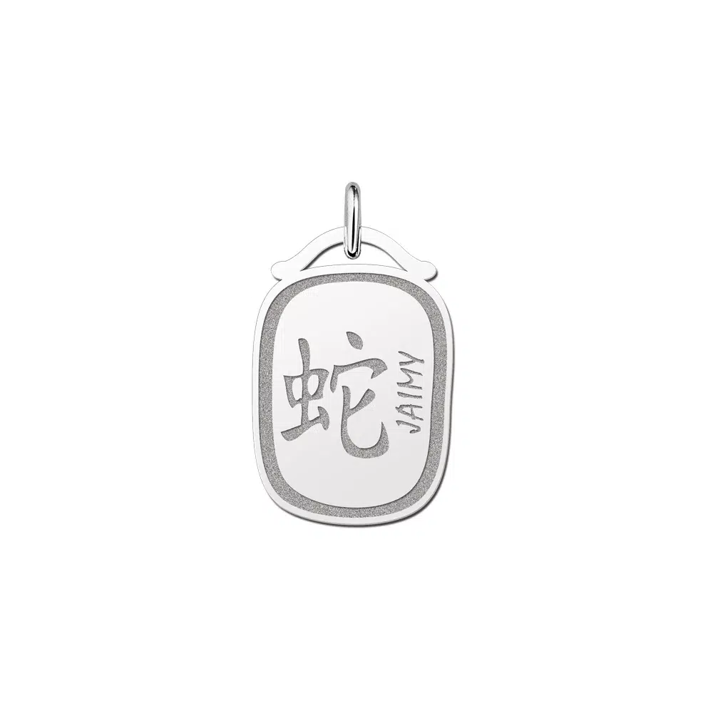 Zilveren hanger met het chinese symbool voor het sterrenbeeld Slang. Geboren in het jaar van de slang, dan is deze ca. 17 x 25 mm. zilveren chinese sterrenbeeld hanger jouw hanger! Natuurlijk graveren wij de naam van jouw keuze in deze mooi vormgegeven zilveren hanger. Mensen die geboren zijn in het jaar van de Slang worden vaak omschreven als intelligent, mysterieus, sensueel en discreet.