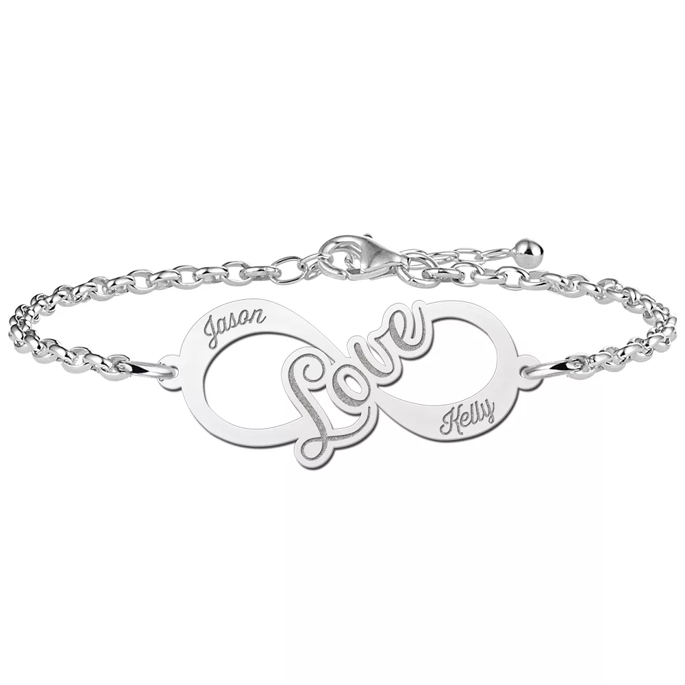 De infinity armband love is een mooie manier om de liefde voor iemand te tonen. Je kan zelf kiezen welke namen je erin gegraveerd wilt hebben.