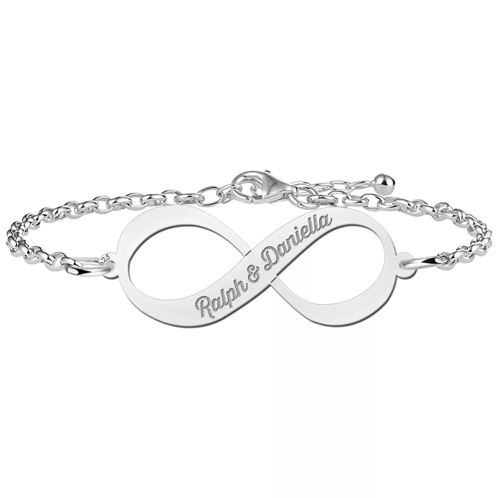 Deze zilveren infinity armband met twee gegraveerde namen is gemaakt van 925 Sterling zilver en heeft een sierlijk lettertype.