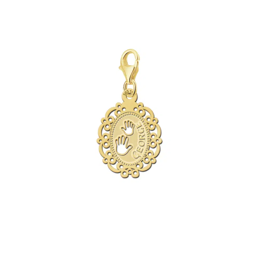 Deze gouden bedel met twee handjes in camee vorm is ca. 15mm x 19 mm groot en wordt geleverd met een fraaie karabijnhaakje waardoor je hem makkelijk aan een armband of ketting kan bevestigen. De gouden bedel heeft een dikte van 0,4 mm en is voorzien van twee kleine handjes en op de hanger wordt de door jouw opgegeven naam gegraveerd in sierlijk lettertype. Een perfect geboortecadeau; mooi voor een nieuwe moeder om te dragen, mooi als herinneringssieraad voor de nieuwe baby! Snelle levering en je betaalt geen verzendkosten!