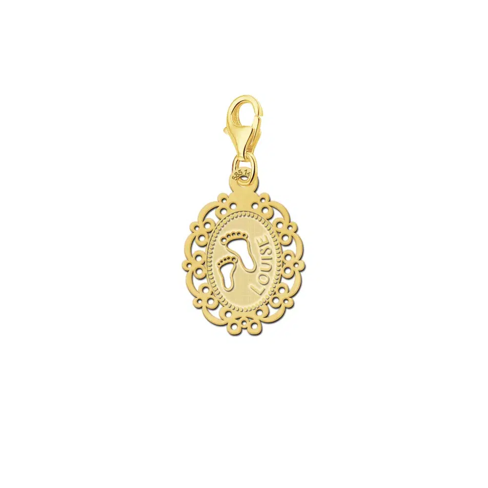 Deze gouden baby charm in camee vorm is ca. 15 mm x 19 mm groot en wordt gemaakt van 0,4 mm dik materiaal. De hanger is voorzien van twee lieve kleine voetjes en daarnaast wordt de door jou opgegeven naam van je keuze gegraveerd in mooie sierlijke letters. Het gouden hangertje wordt geleverd met een karabijnhaak waardoor hij eenvoudig te bevestigen is aan een armband of ketting. Een waardevol herinneringssieraad voor iedere nieuwe moeder! Snelle levering en je betaalt geen verzendkosten!
