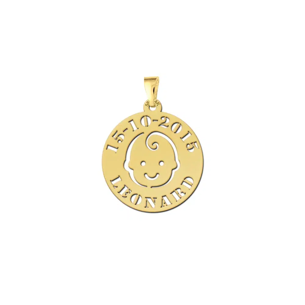 Deze 20mm ronde gouden babyhanger met krul wordt voorzien van de naam en geboortedatum van de pasgeborene!