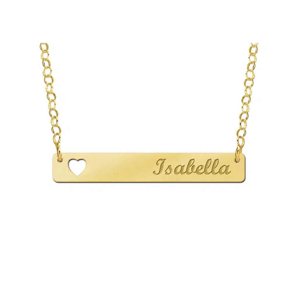 Dit is een gouden bar naamketting met een liefdevol hartje. Wat een schattige hartje in deze gouden naamketting met bar is dit. Deze 14 karaat gouden bar naamketting met hartje heeft een grote van 40 x 6 mm en een dikte van 0, 6 mm. Geef ons jouw passende liefdevolle tekst door en wij maken voor jou een oogverblindende gouden bar naamketting met daarin een hartje. De gouden Bar naamketting met hartje wordt geleverd inclusief een 42 cm lange gouden jasseron ketting. Wat geweldig om deze gouden bar naamketting met hartje cadeau te geven!