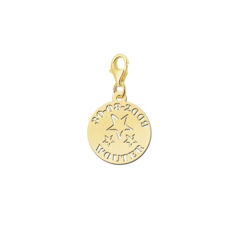Gouden bedel sterretjes met naam en datum Dit gouden bedeltje met sterretjes wordt voorzien met de naam en datum van jouw keuze. Door de karabijnhaak aan de hanger, kan je de bedel makkelijk aan een armband of collier hangen. Het materiaal waar wij de bedel van maken is 0,4 millimeter dik en van echt 14 karaats goud. De bedel heeft een diameter van 16mm. Snelle levering en je betaalt geen verzendkosten!
