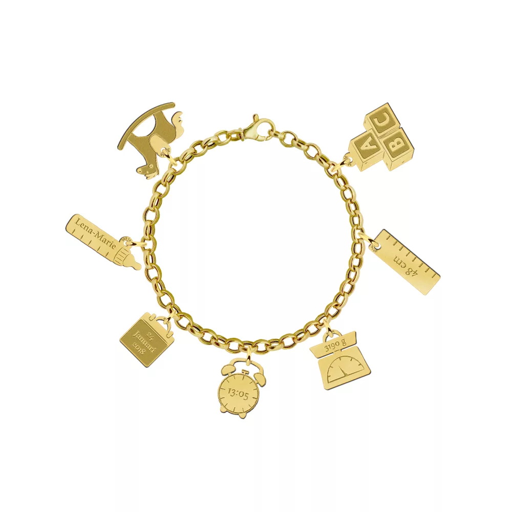 De geboorte van het eigen kind is een bijzonder moment. Onze 14 karaat gouden armband met zeven verschillende bedels maakt het mogelijk om dit moment te vereeuwigen.