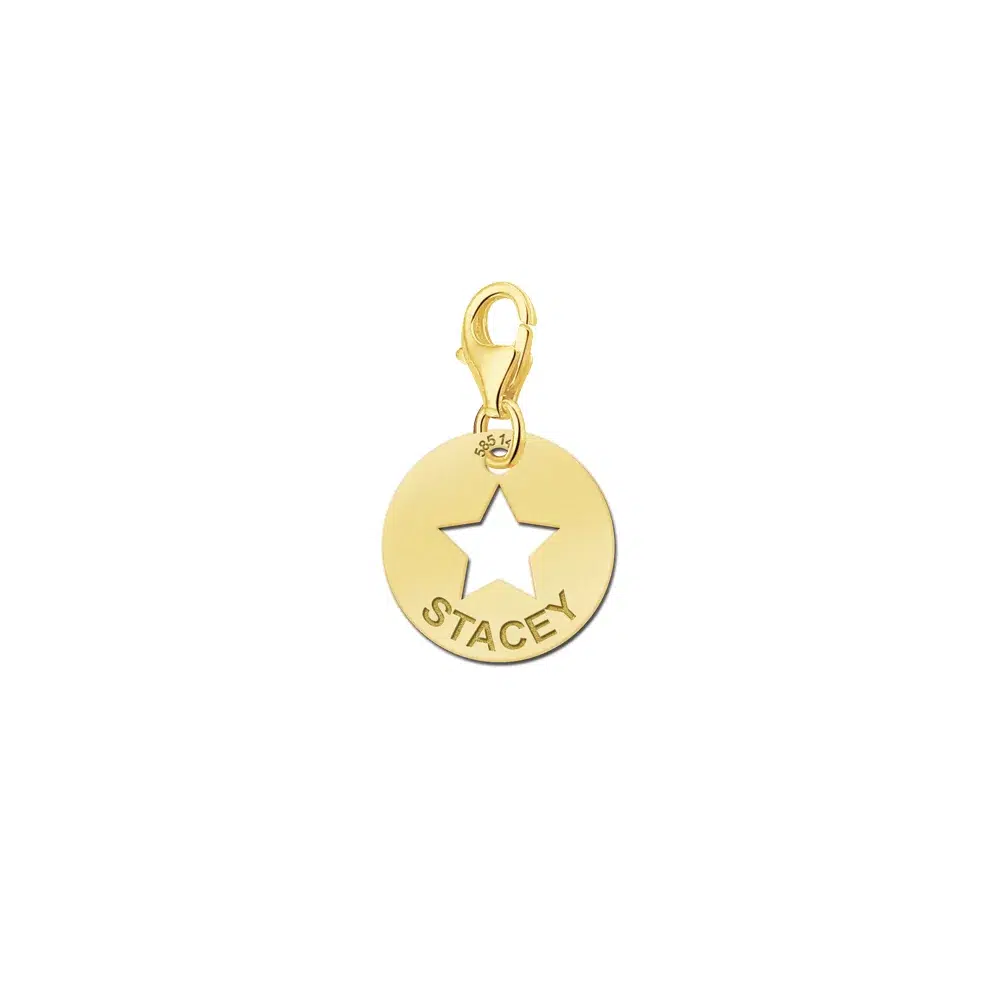 Deze ronde gouden bedels met een ster wordt voorzien met de naam van jouw keuze.