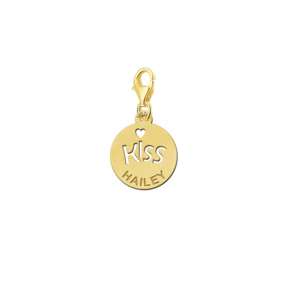 Dit leuke 14 karaats gouden kiss hangertje is 144 in het rond en wordt gemaakt van 0,4 mm dik materiaal. In het bedeltje graveren wij de naam of tekst van je keuze in een sierlijk lettertype. Deze leuke hanger wordt geleverd met een handig karabijnhaakje om hem aan een armband of ketting te kunnen bevestigen.