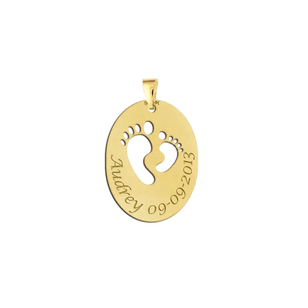 De gouden geboorte sieraad met voetjes is ovaal van vorm en heeft twee uitgespaarde voetjes. Dit zal zeker opvallen! In dit gouden geboorte sieraad met voetjes graveren wij twee woorden, zoals bijvoorbeeld de naam en geboortedatum van je kind. Met een mooi lettertype graveren wij dit geboorte hangertje van goud.