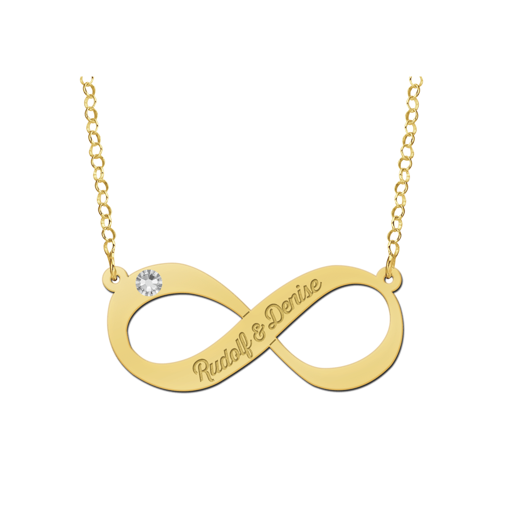 De gouden hanger infinity met daarin een zirkonia gezet is ca. 35mm x 15mm en wordt voorzien van de door jouw opgegeven naam of tekst. Het infinty symbool heeft wereldwijd de betekenis van oneindigheid. Daarnaast staat het infinity symbool voor constante vernieuwing, harmonie, evenwicht en verbondenheid.De infinity hanger wordt gemaakt van een 14 karaats gouden plaatje van 0,6mm dik.De hanger wordt geleverd inclusief een fraaie 14 karaats gouden jasseron ketting van met een lengte van 45 cm.Wij garanderen een snelle en gratis levering.