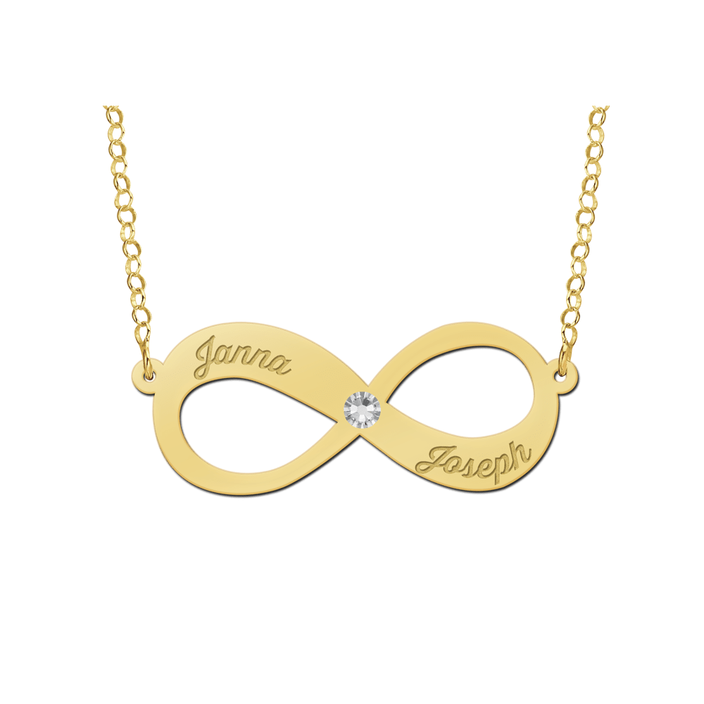 De gouden hanger infinity met daarin twee namen en een zirkonia is ca. 35mm x 15mm en wordt voorzien van de door jouw opgegeven namen of tekst. Het infinty symbool heeft wereldwijd de betekenis van oneindigheid. Daarnaast staat het infinity symbool voor constante vernieuwing, harmonie, evenwicht en verbondenheid.De infinity hanger wordt gemaakt van een 14 karaats gouden plaatje van 0,6mm dik.De hanger wordt geleverd inclusief een fraaie 14 karaats gouden jasseron ketting van met een lengte van 45 cm.Wij garanderen een snelle en gratis levering.