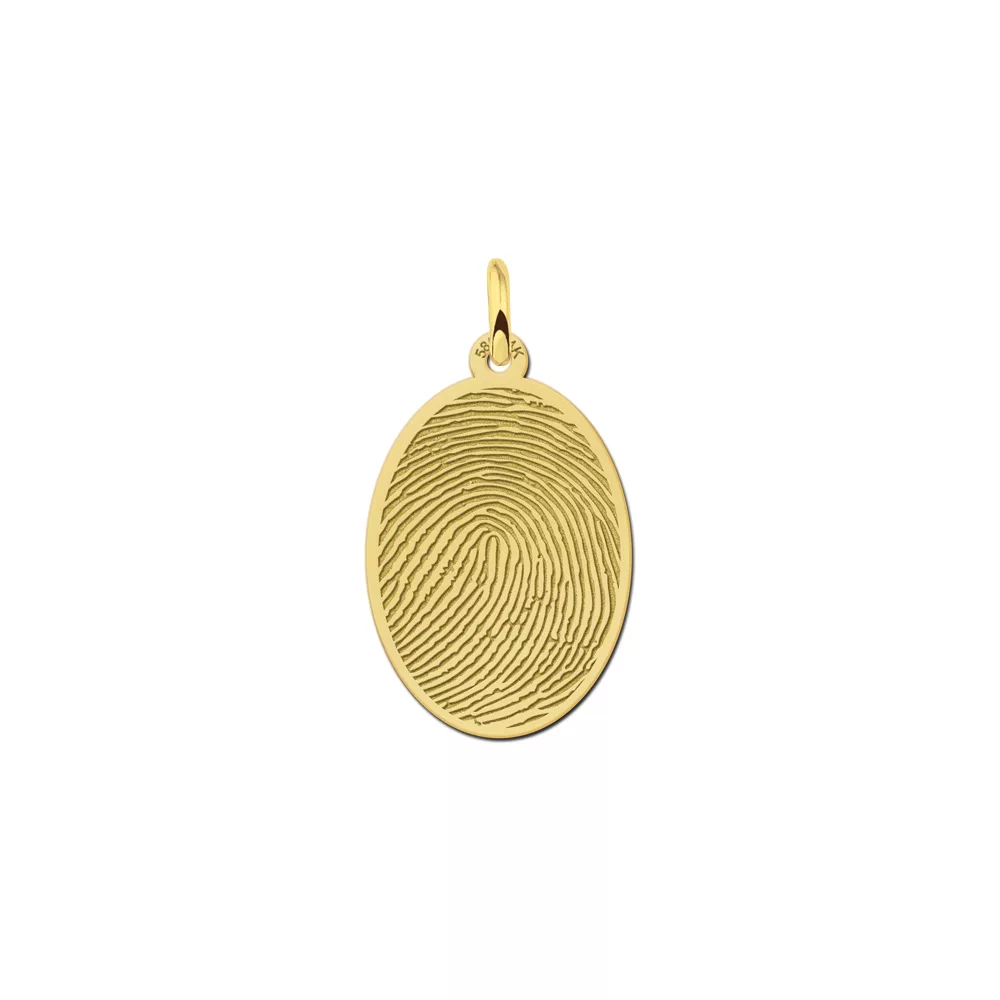 Gouden hanger ovaal met vingerafdruk. Deze gouden ovale vingerafdruk hanger heeft een formaat van ca.24,5 x 16 mm. De door jouw ingezonden vingerafdruk graveren wij vullend in dit gouden sieraad met een dikte van 0,4 mm. Een gouden vingerafdruk van jezelf of van die ene speciale persoon. Een prachtig gedenksieraad wat mooi is om te geven of om te krijgen! Maak de hanger compleet en bestel meteen één van onze bijpassende kettingen bij! Snelle levering, geen verzendkosten.