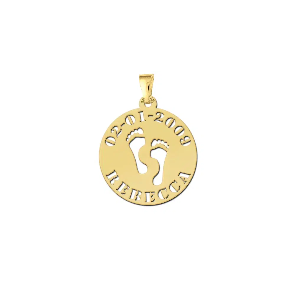 Gouden baby hanger voetjes met naam en datum. Schitterende gouden baby hanger voorzien van lieve babyvoetjes. De hanger is ongerveer 20 mm rond en de naam en (geboorte)datum wordt erin verwerkt. Origineel kraamkado! Bijpassende gouden ketting apart verkrijgbaar! Nederlands produkt, snel in huis. Gratis verzending!