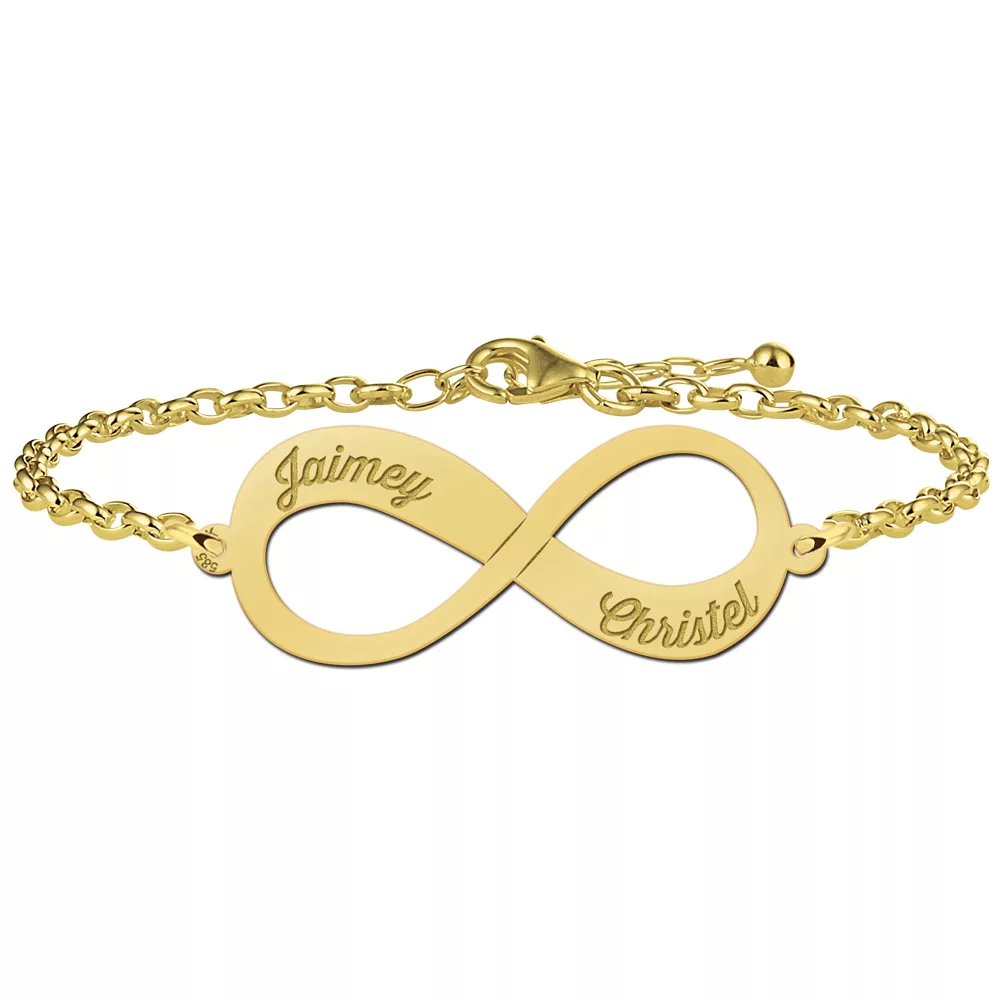 Een schattige 14 karaat gouden infinity armband welke je kunt personaliseren met twee gravures.
