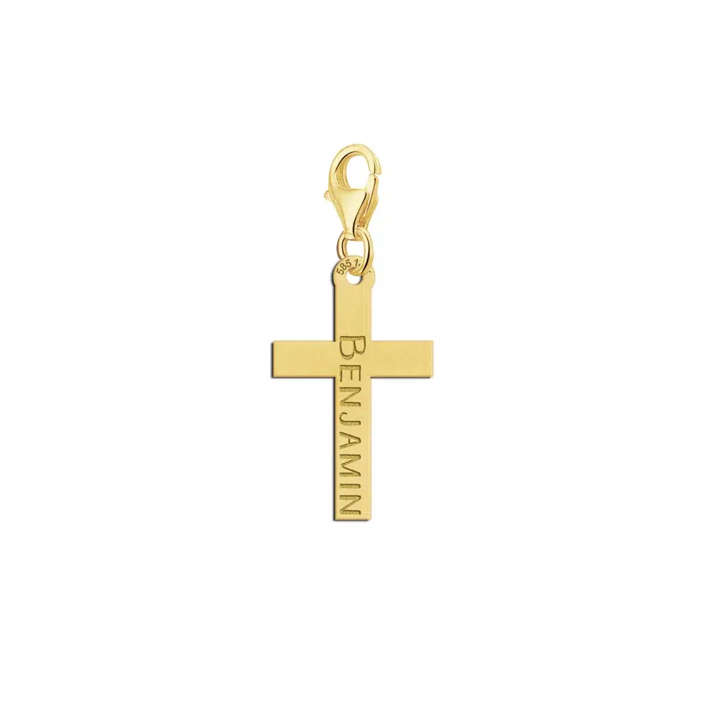 Dit gouden bedeltje van een kruisje kan gegraveerd worden met de door jou opgegeven naam. Aan dit kruisje is een karabijnhaakje bevestigd waarmee deze charm heel gemakkelijk aan een armband of ketting te bevestigen is. Het bedeltje van goud is ongeveer 16mm x 17 mm groot en maken wij van 0,4 mm dik plaatmateriaal. Vergeet niet om in onze webshop een leuke gouden armband of ketting mee te bestellen! Wij zorgen voor een snelle en gratis verzending.