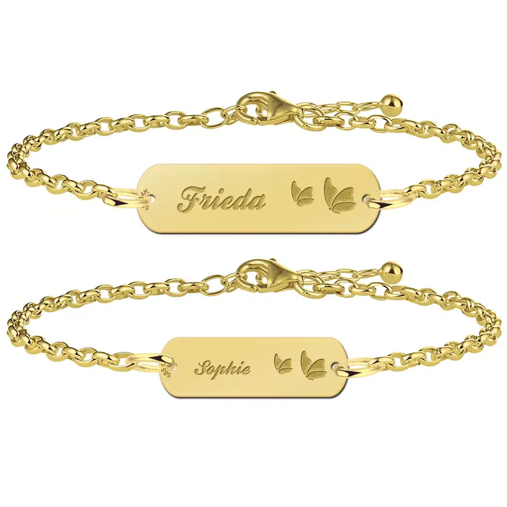 Het naamplaatje heeft een dikte van 0,4 mm en wordt bevestigd aan een gouden armband met ankerschakel en karabijnsluiting. Een moeder dochter armband met naam en vlinders. In deze armbanden set kun je dus de naam van jou en je dochter laten graveren links naast een groot en klein vlindertje. Een unieke mama armband die onderdeel is van ons nieuwe moeder-dochter armband collectie. Een collectie die er op gericht is om moeders en dochters dichter bij elkaar te brengen.