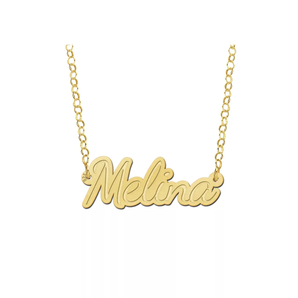 Dit mooie naamketting model heeft een sierlijk uiterlijk en kan met elke naam gegraveerd worden. De naam ketting is gemaakt van 14 karaat goud en heeft een lengte van 42 cm. Het plaatje heeft een dikte van 0, 6 mm. De afmeting van de naam in het voorbeeld is 30 mm x 10 mm. Dit is slechts indicatief en hangt van de naam af.