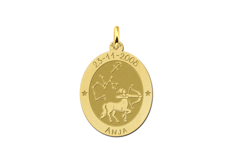 Deze Boogschutter-gravering in de 0,4 mm dikke ovalen gouden hanger, laat uw sieraden collectie fonkelen. Deze ovale mode highlight voor Boogschutters, vertelt het persoonlijke verhaal van de Boogschutter-vrouw, de idealist onder de stererenbeelden en van de avontuurlijke Boogschutter-man.