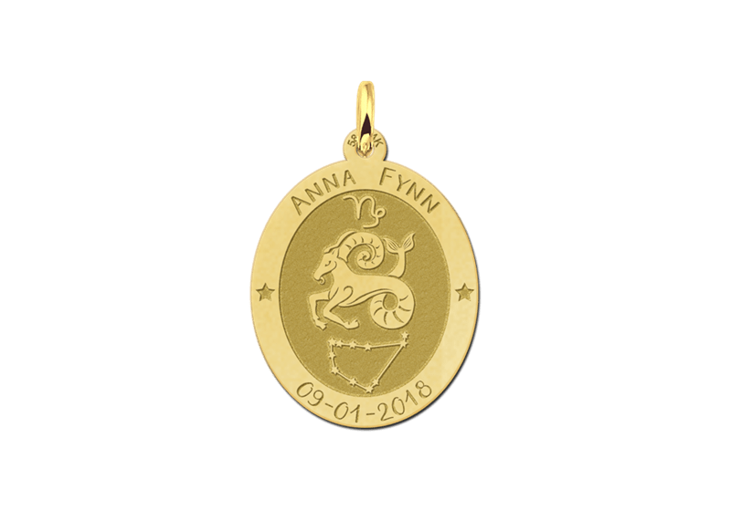 Op deze sieraad is het sterrenbeeld Steenbok gegraveerd. De Steenbok geborene is een mens met een praktische en zakelijke wil. Deze Steenbok-hanger is vervaardigd van 0,4 mm dik 14 karaat goud en versierd met Steenbok-tekens en persoonlijke gravure.