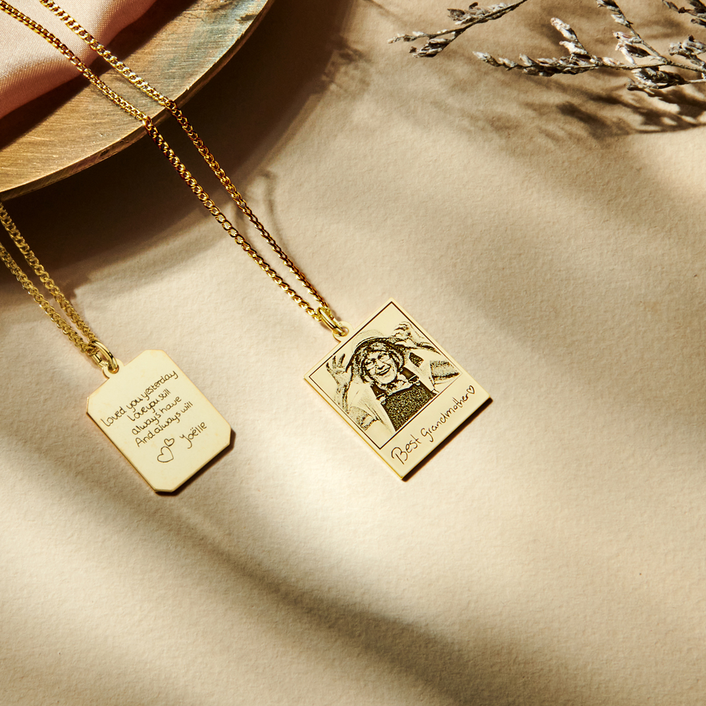 Deze gouden fotohanger kan worden gepersonaliseerd met uw eigen handschrift. Ernaast kun je ook een bijpassende ketting voor de hanger kiezen. We hebben kettinglengtes van 38 – 42cm en 45 – 50cm. Hier kan je kiezen uit verschillende soorten kettingen. Wil je de ketting cadeau geven? Dat komt mooi uit! Je ontvangt deze namelijk in een mooi sieradendoosje.