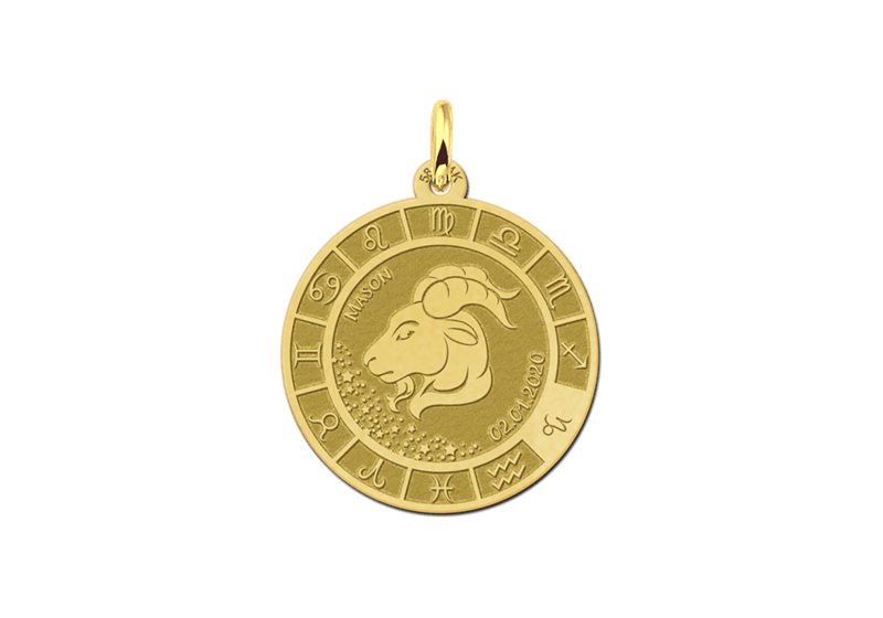 Op deze sieraad is het sterrenbeeld Steenbok gegraveerd. De Steenbok geborene is een mens met een praktische en zakelijke wil.