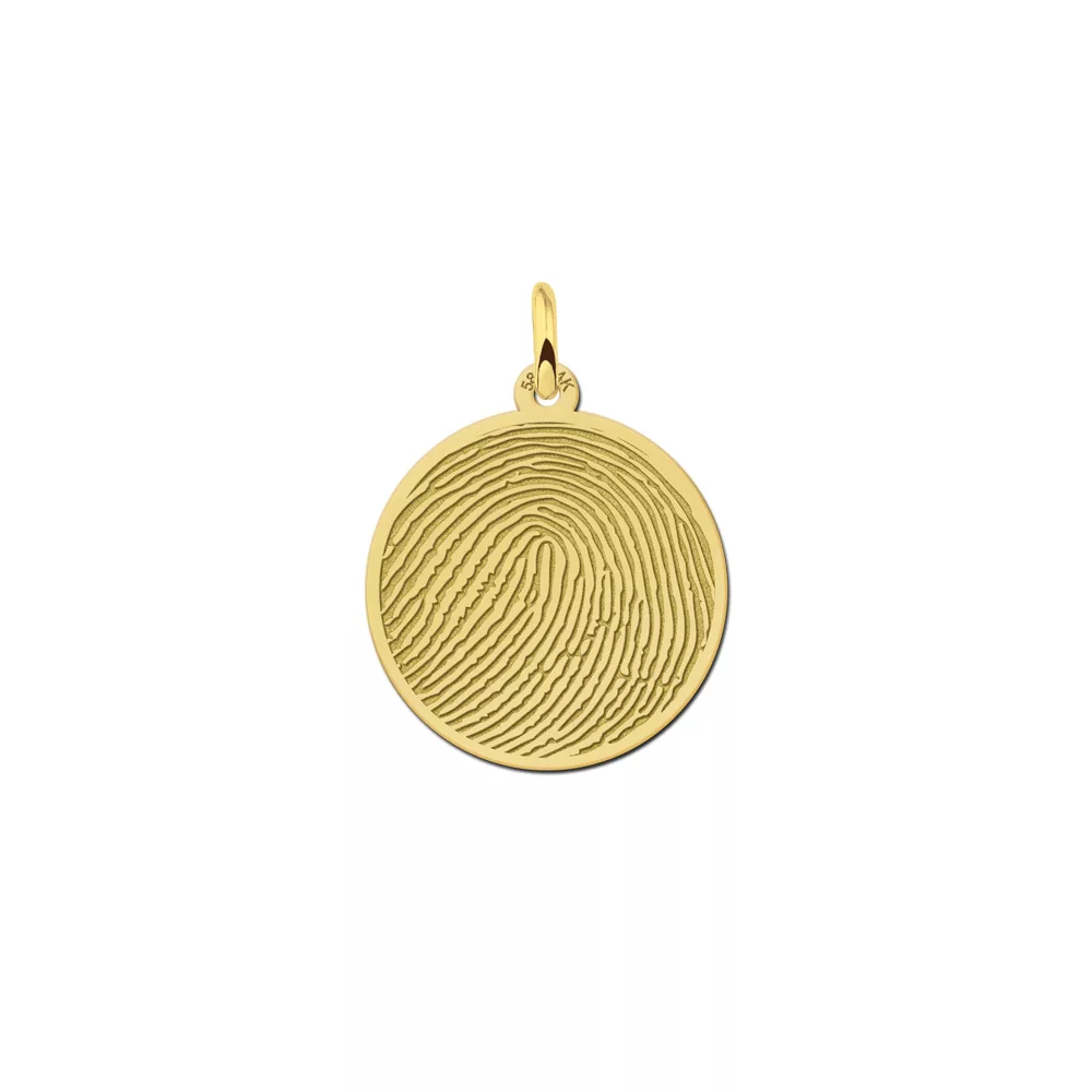 14 karaat gouden sieraad vingerafdruk rond. Dit ronde sieraad met vingerafdruk heeft een diameter van 20 mm en een dikte van 0,4 mm. De door jouw ingezonden vingerafdruk graveren wij vullend in deze ronde gouden hanger. Maak de hanger compleet en bestel één van onze mooie bijpassende kettingen mee! Je betaald bij ons géén verzendkosten!