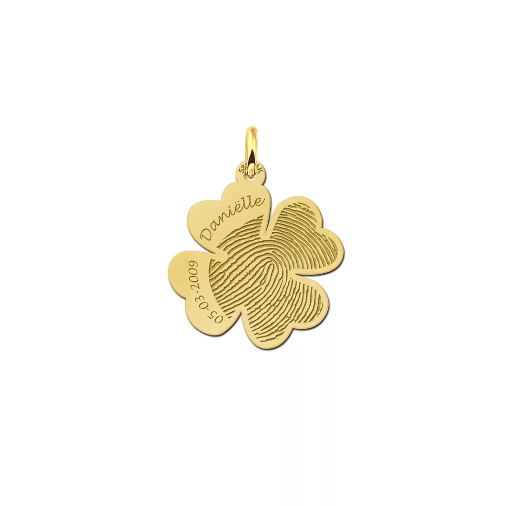 14 karaat gouden vingerafdruk hanger met naam en datum. Een prachtig gouden gedenksieraad die wij niet alleen voorzien van de door jouw ingezonden vingerafdruk maar ook van de gewenste naam en datum. Een zeer persoonlijk sieraad, want iedere vingerafdruk is uniek. Deze gouden geluksbrenger met naam en datum staat symbool voor de bijzondere band met de overleden dierbare en kan veel troost bieden na het verlies. De gouden klaver met vingerafdruk en naam en datum heeft een formaat van ca 21 x 22 mm en is 0,4 mm dik. Bijpassende gouden colliers zijn los verkrijgbaar.