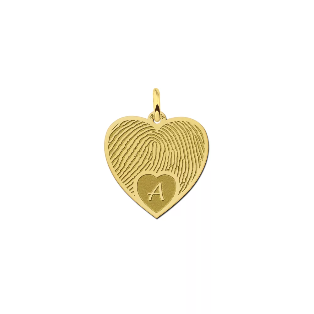Gouden vingerafdruk sieraad hart met initiaal. Dit gouden vingerafdruk sieraad hart wordt vervaardigd van 14 karaat goud met een dikte van 0,4 mm. Bent u op zoek naar een speciaal sieraad dat de speciale band tussen u en uw geliefde symboliseert? Dan is deze hart hanger van goud met vingerafdruk en initiaal misschien precies wat u zoekt. Wij maken de gouden hart hanger met de vingerafdruk die door u wordt ingezonden. Ook plaatsen wij de door u opgegeven initiaal in de hanger. Een persoonlijker en unieker gouden hart sieraad met vingerafdruk kan bijna niet! Bijpassende gouden colliers voor bij onze vingerafdruk sieraden zijn los verkrijgbaar.