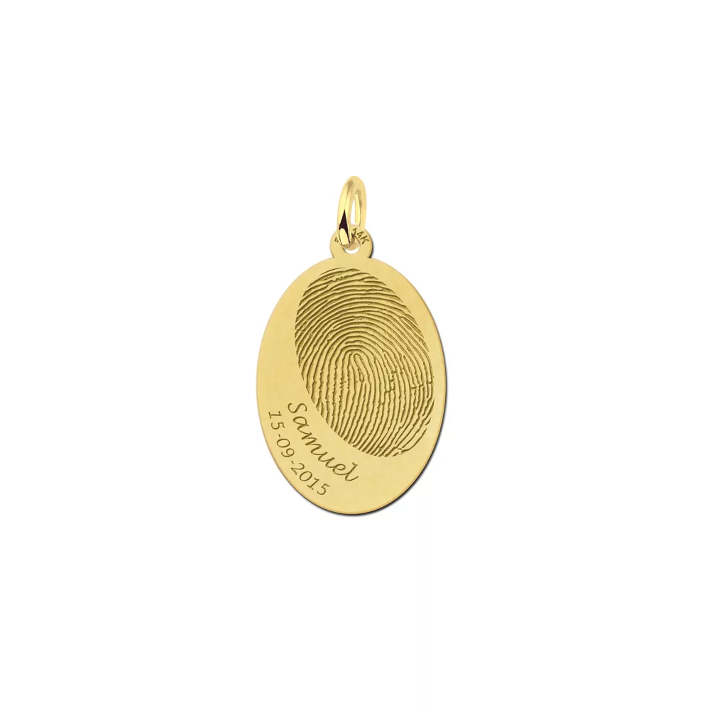 Gouden vingerafdruk sieraad naam en datum in de vorm van een ovaal. Een zeer mooie gouden hanger met een formaat van ca. 24,5 mm x 16 mm en een dikte van 0,4 mm. In dit gouden sieraad graveren wij niet alleen de door jouw opgegeven naam en datum, maar ook een door jouw ingestuurde vingerafdruk! Dit ovale gouden sieraad met vingerafdruk is een zeer mooi gedenksieraad. Maak de hanger compleet met een mooie bijpassende ketting uit ons assortiment. Snelle levering en géén verzendkosten!