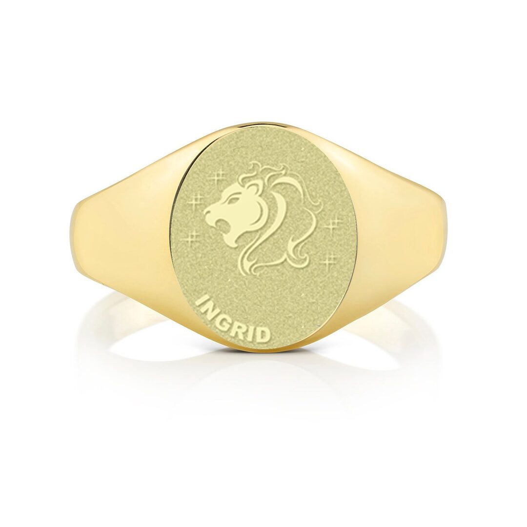Gouden zegelring ovaal met horoscoop en gravure – Leeuw