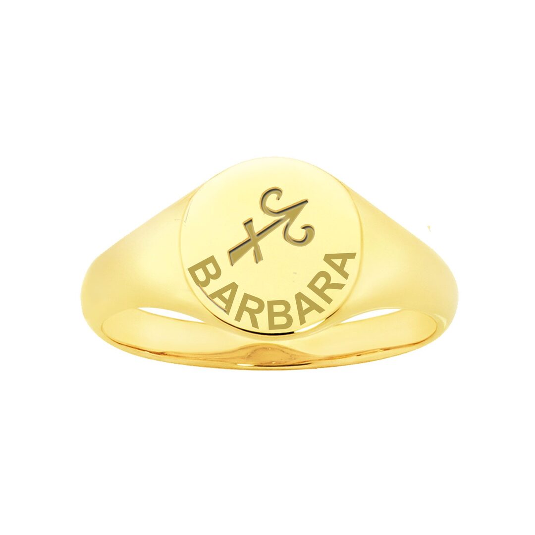Op deze gouden rond ring is het sterrenbeeld Boogschutter gegraveerd. De Boogschutter is optimistisch, vrolijk, eerlijk en intellectueel. Hij of zij heeft een positieve kijk op het leven en zijn geest is altijd open voor nieuwe perspectieven.