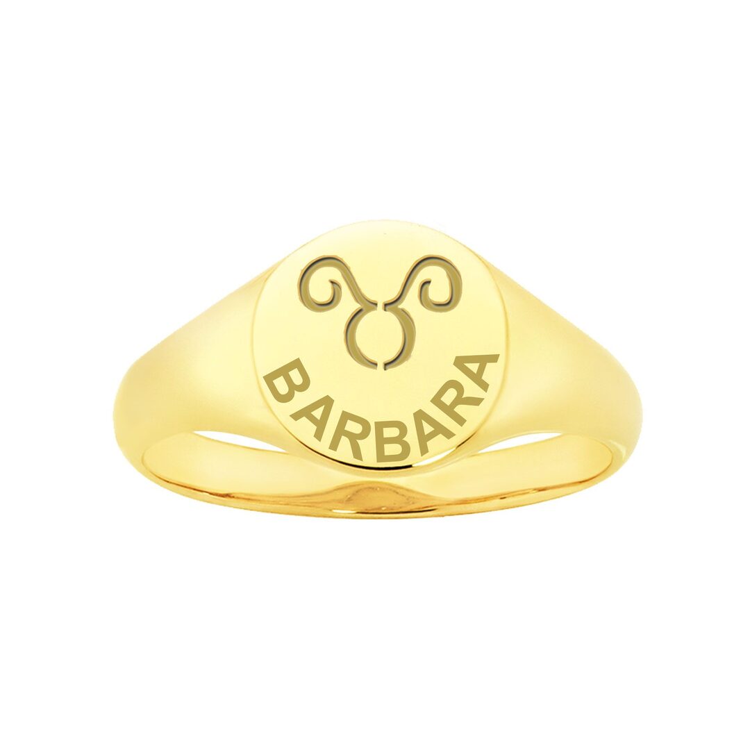 Op deze gouden rond ring is een Stier sterrenbeeld gegraveerd. De Stier is gemakkelijk in de omgang, openhartig, jeugdig en levendig. Hij of zij houdt van nieuwe activiteiten en zit vol fantasie.