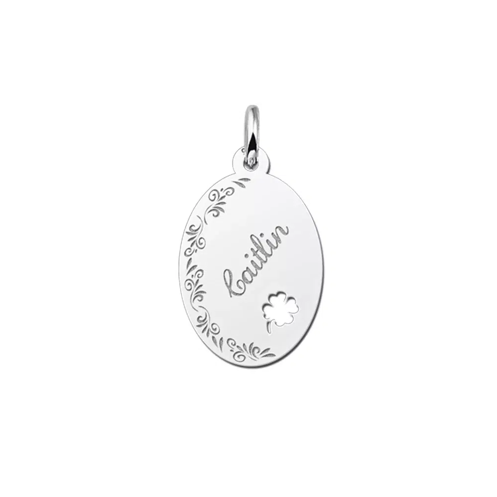 Dit is een elegante zilveren hanger om je naam in te laten graveren met een geluks klavertje vier. Misschien ken jij iemand die wel wat geluk kunt gebruiken? Dan zou dit het geschikte cadeau kunnen zijn! Of ben jij zelf iemand die veel geluk nodig heeft, dan kan jij zelf ook wel zo’n in het oog springende hanger met je naam gebruiken. Geef ons jouw naam door en wij zullen het er met veel plezier voor je in graveren. De ovale hanger heeft een doorsnede van 14 x19 mm, maar…. is zonder kettinkje, dus bestel dat er wel bij!