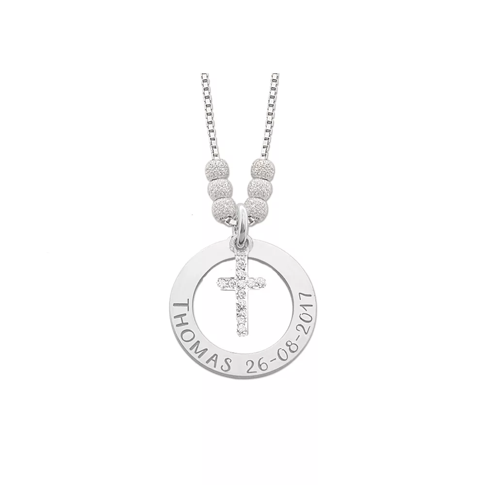 Zeer persoonlijke mama ketting van zilver met een kruis! Deze zilveren mamaketting wordt vervaardigd van hoogwaardig 925 sterling zilver en compleet geleverd met een zilveren venetiaanse ketting met 6 gediamanteerde zilveren kralen. De totale lengte van de ketting is 42 cm maar ook verstelbaar op 38 cm. De ronde zilveren hanger wordt gemaakt met een diameter van ca. 17 mm en een dikte van 0,7 mm. In de hanger graveren wij een korte tekst, de naam en geboortedatum van de pasgeborene of de namen van al je kinderen! Om de mama ketting helemaal af te maken hangen we er nog een zilveren hartje ingezet met zirkonia’s aan. Verwen je partner of moeder met deze persoonlijke zilveren mama ketting!