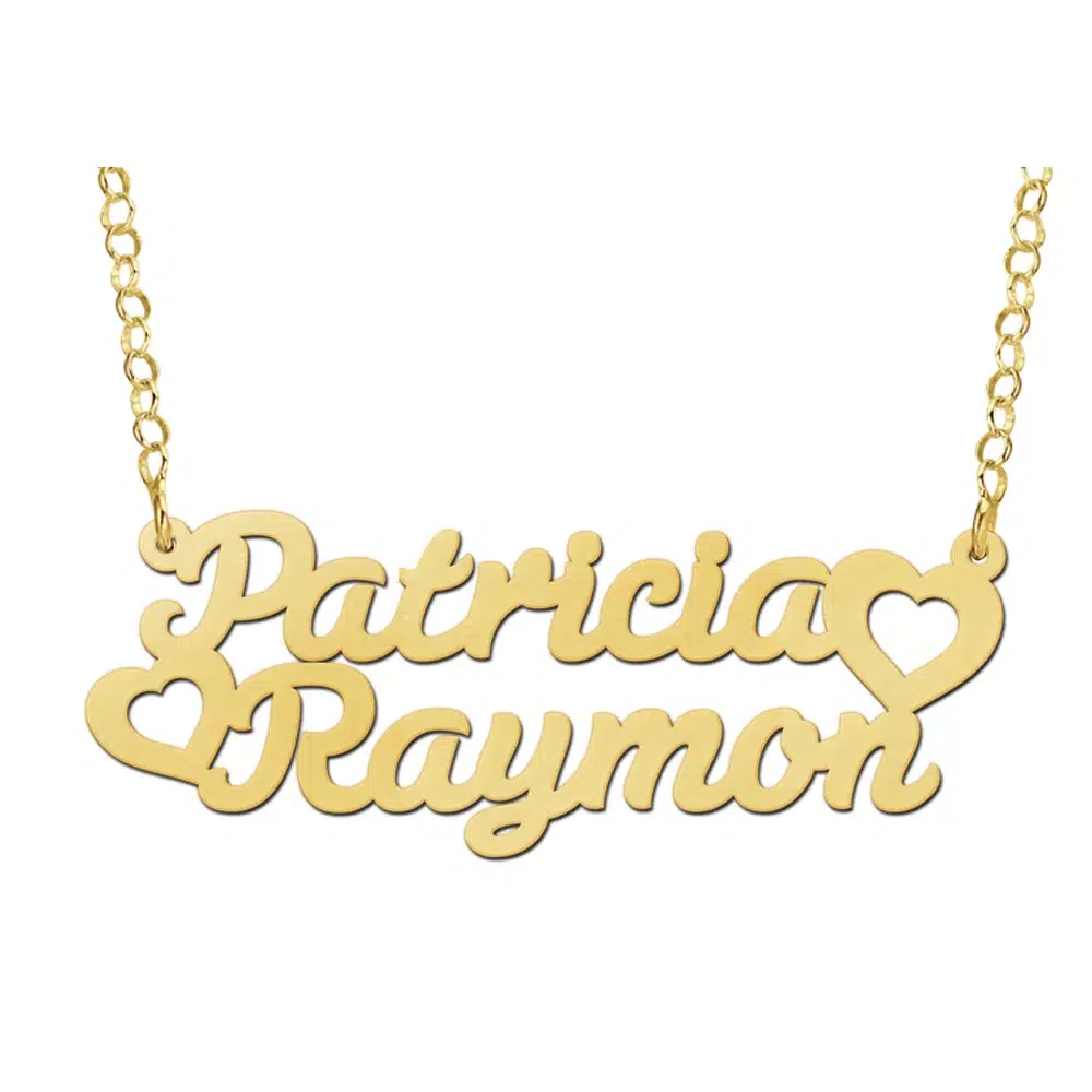 Naamketting goud verguld voor 2 namen in schrijfletters. Een liefdesverklaring als sieraad. Een gemiddelde maat van dit model is ca. 20mm hoog x 50mm breed. Maat is ter indicatie! Het formaat en plaatsing van de hartjes is afhankelijk van de bestelde namen. De naam dikte is 0, 6 mm. Snelle levering en je betaalt geen verzendkosten!