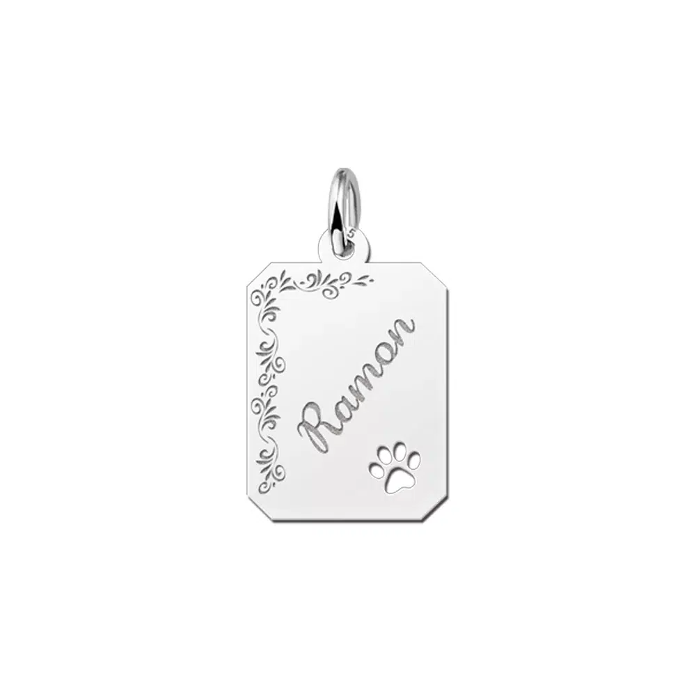 Jouw naam laten graveren in dit naamsieraad van zilver recht met bloemrand en een lief klein pootje erbij.