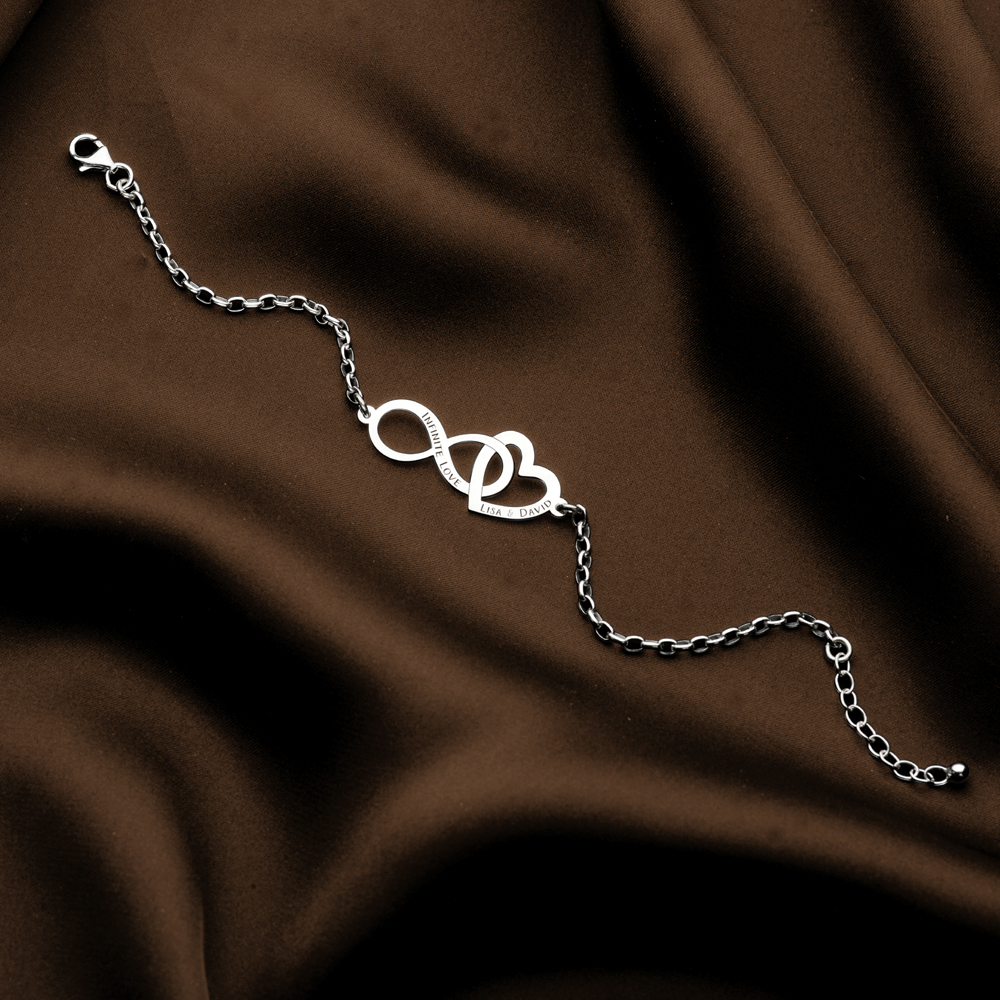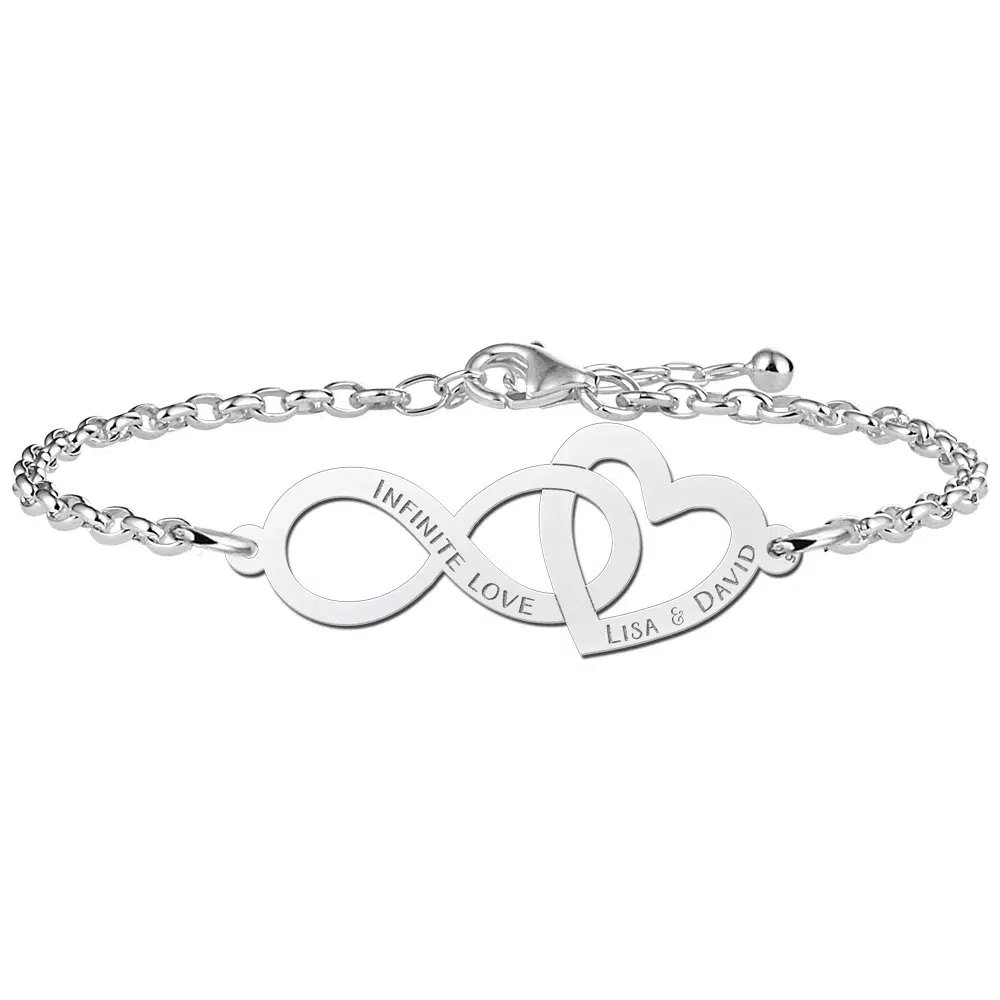Deze armband met infinity en hartje kan gepersonaliseerd worden met een tekst en namen.