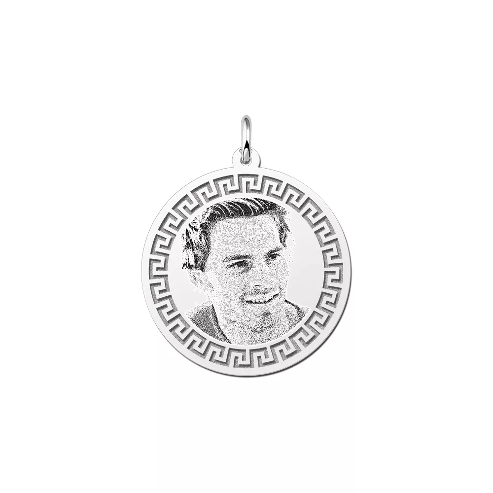 Unieke fotohanger met meander rand vervaardigt van hoogwaardig 925 sterling zilver. Deze ronde fotohanger met meander rand heeft diameter van 27 mm en een dikte van 0,7 mm. Onze fotohangers worden vervaardigt via de nieuwste technieken. Onze designers maken een mooie uitsnede van de foto die door jou wordt aangeleverd waarna deze in de ronde fotohanger met meander rand van zilver gegraveerd wordt. De fotogravure vervaagt niet en gaat ook niet van de hanger af. Wij maken de fotogravure via een speciale techniek donkerder, waardoor de foto altijd goed zichtbaar is. Zo krijgt je zilveren fotohanger met meander rand de perfecte afwerking! De fotohanger met elegante meander rand van zilver kunnen wij graveren met de mooiste foto van je vader of moeder, geliefde of kind. Een persoonlijker sieraad kan bijna niet. Wie komt bij jou op de fotohanger te staan? Bijpassende zilveren kettingen zijn los verkrijgbaar, we hebben diverse soorten in ons assortiment! Hoe werkt het? 1. Upload de foto die je op de fotohanger wilt 2. Let op dat je het beste resultaat krijgt met een foto waarin het gezicht van de desbetreffende persoon centraal staat (portretfoto). De kwaliteit is het beste met portretfoto’s vanaf 700 x 700 pixels. Wij maken dan een uitsnede waarbij het hoofd en gezicht van de gefotografeerde persoon het best tot zijn recht komt. 3. Je selecteert de ketting die je wilt (of kiest ervoor om de hanger zonder ketting te bestellen) 4. Heb je een andere wens of een speciaal verzoek? Neem dan contact op met onze klantenservice. Wij helpen je graag! 5. Plaats je bestelling in de winkelwagen en reken af.