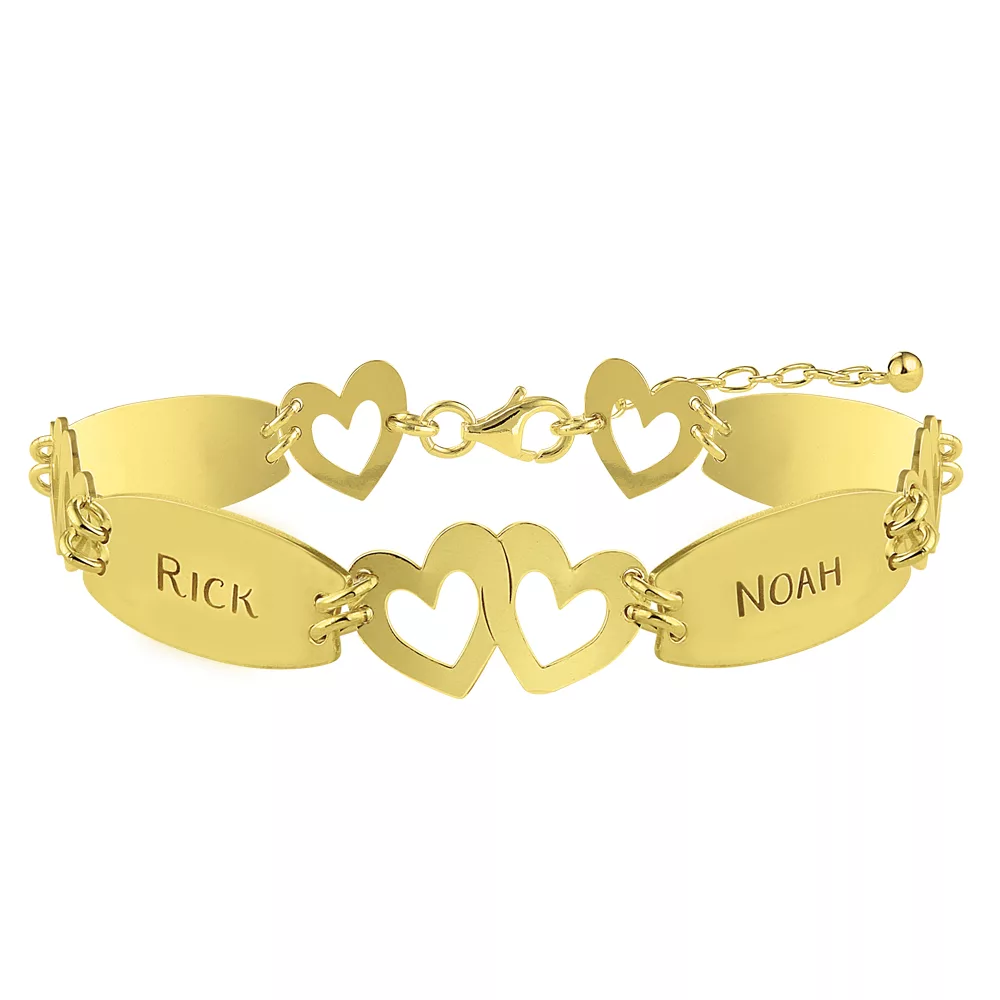Deze gouden armband met hartjes kan gepersonaliseerd worden met vier namen.